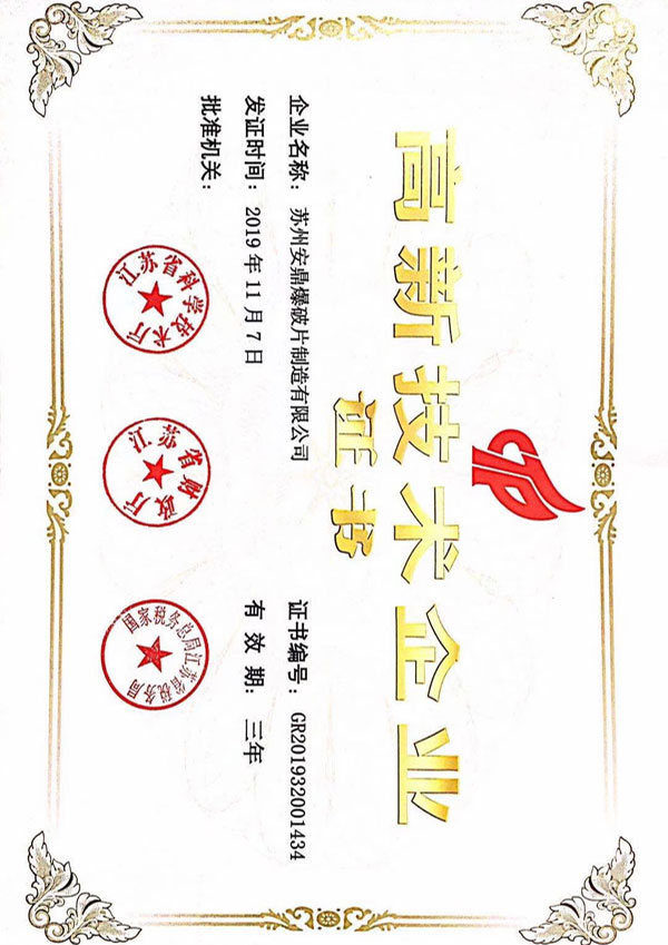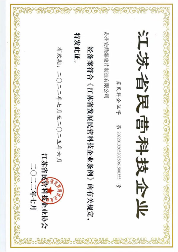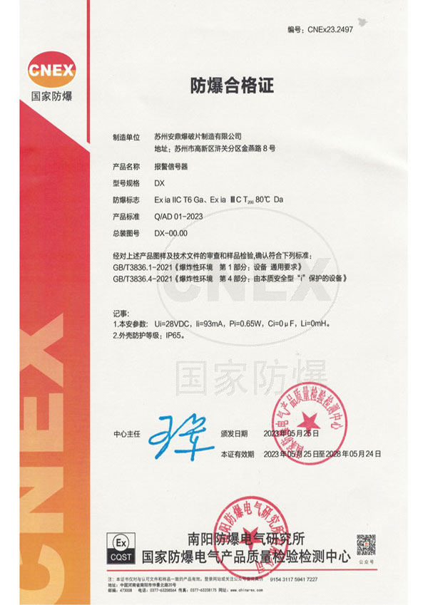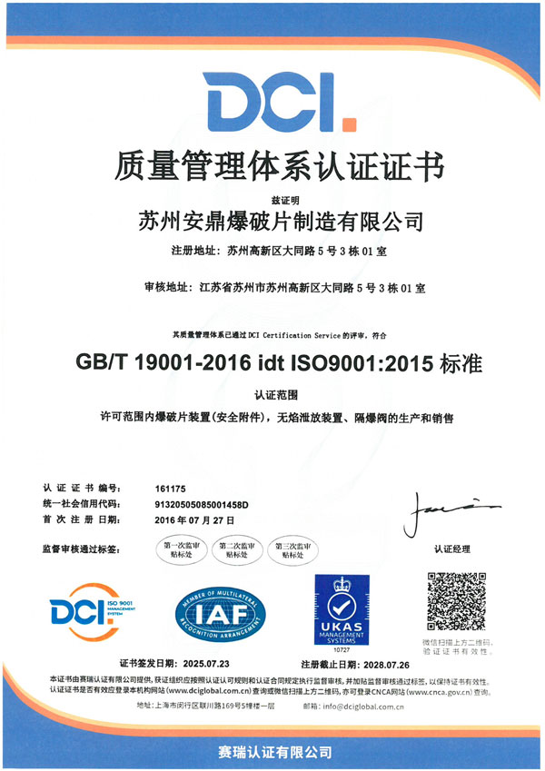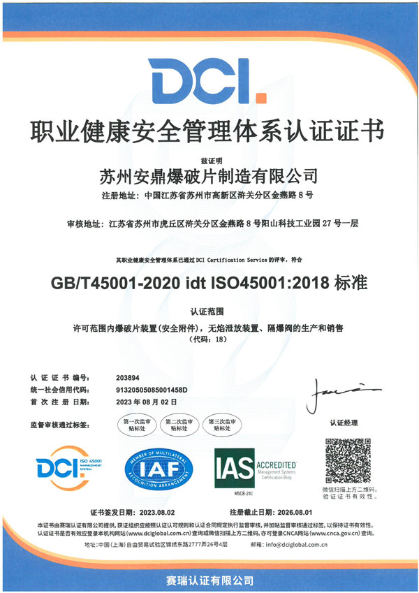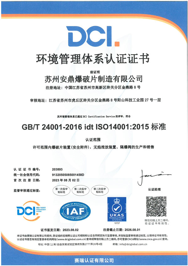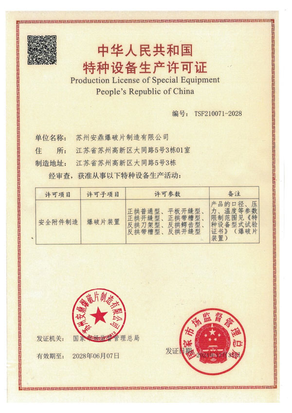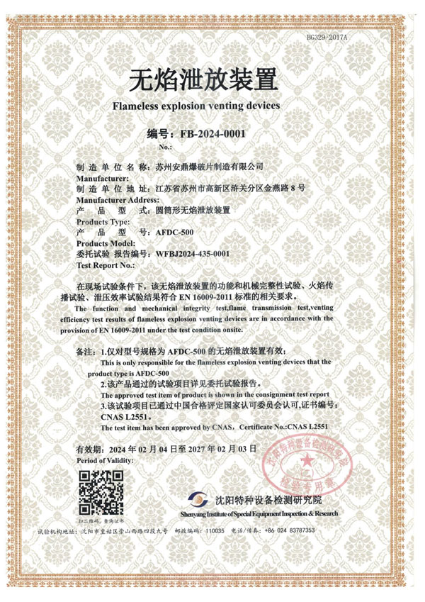 苏州安鼎爆破片制造有限公司成立于2009年,专注于爆破片装置、无焰泄放装置、隔爆阀装置等安全产品的研发、制造和销售。爆破片装置取得国家市场监督管理总局颁发的特种设备生产许可证,粉尘产品通过沈阳特检院CNAS、东北大学实验室等认证,部分产品通过国家防爆CNEX认证。通过ISO9001质量管理体系、ISO14001环境管理体系、ISO45001职业健康安全管理体系认证。